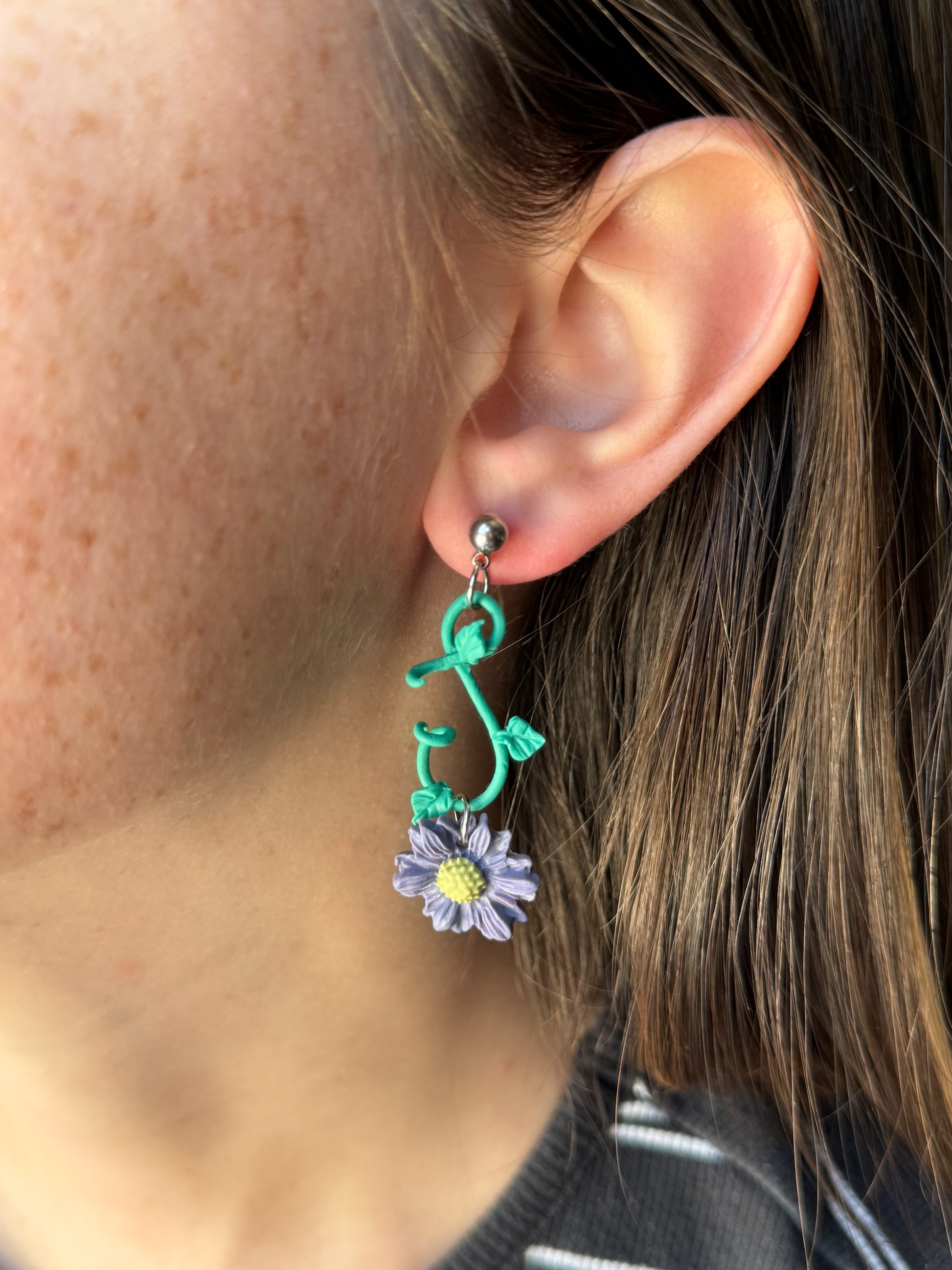 A single handcrafted clay aster delicately sways beneath a slender, winding vine, capturing the quiet elegance of nature’s graceful movement. Suspended from a fine metal setting, the flower and vine create a harmonious balance—organic yet refined, structured yet free-flowing.