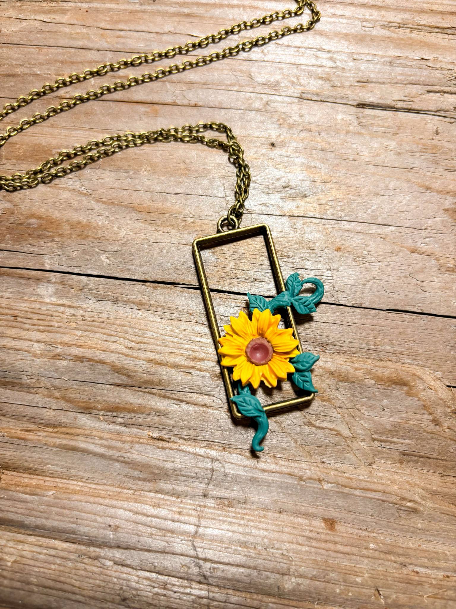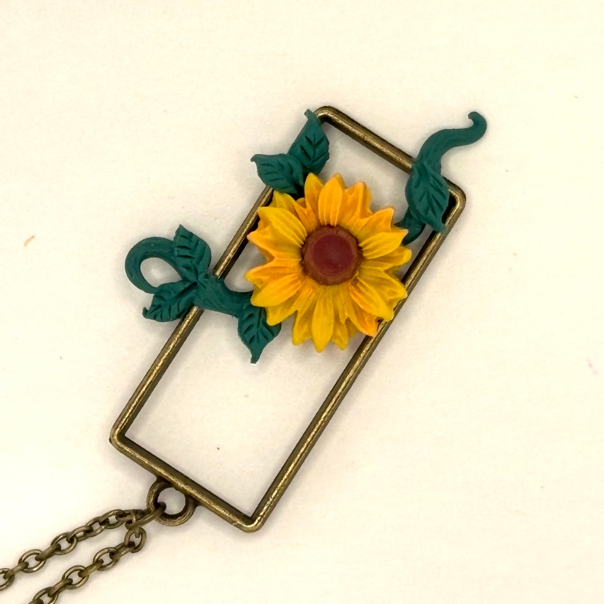 A radiant sunflower blooms among thick, sculpted vines, framed within a rectangular metal bezel. With flowing textures and an organic composition, it evokes a picturesque garden scene full of warmth and charm.