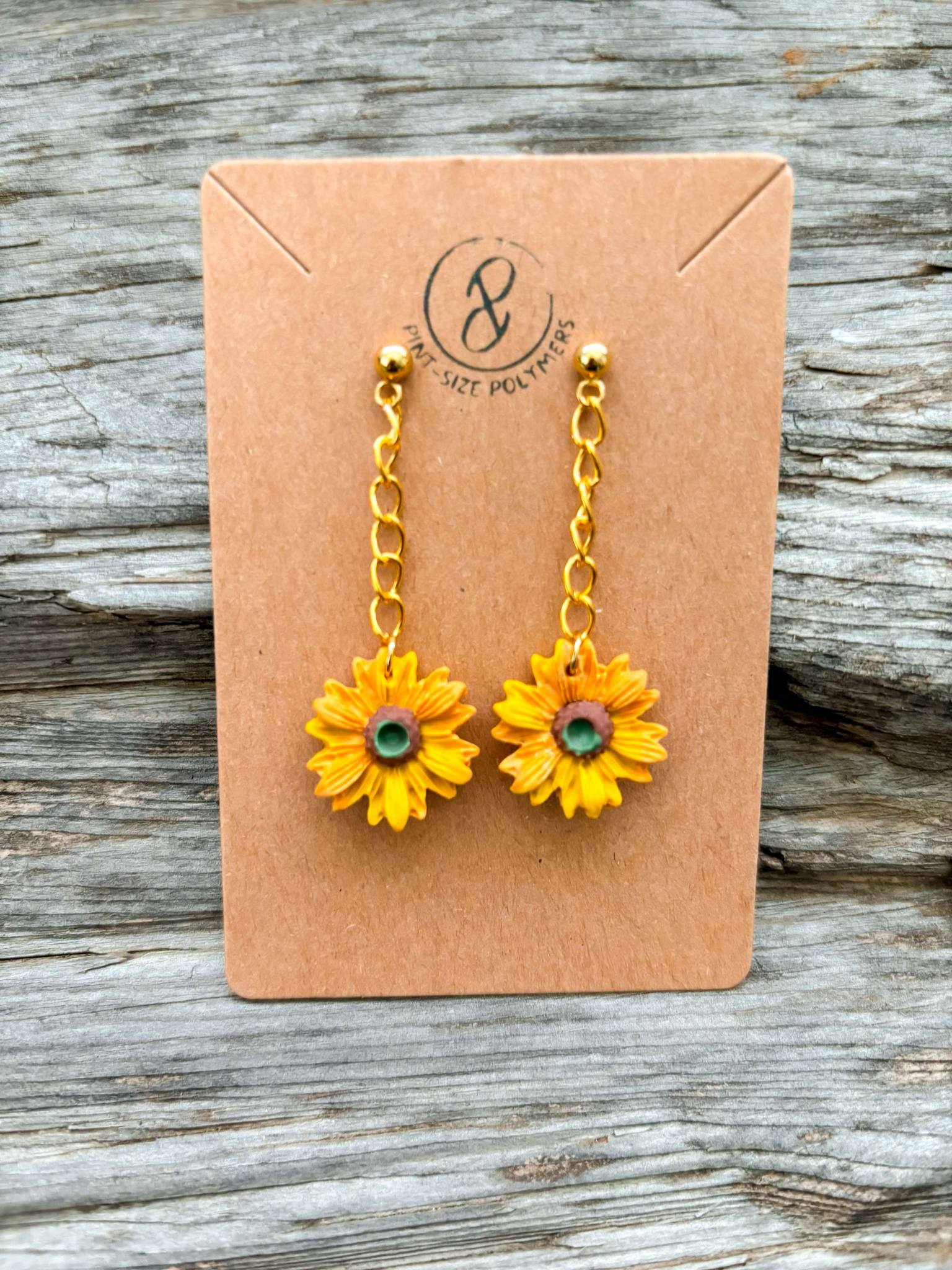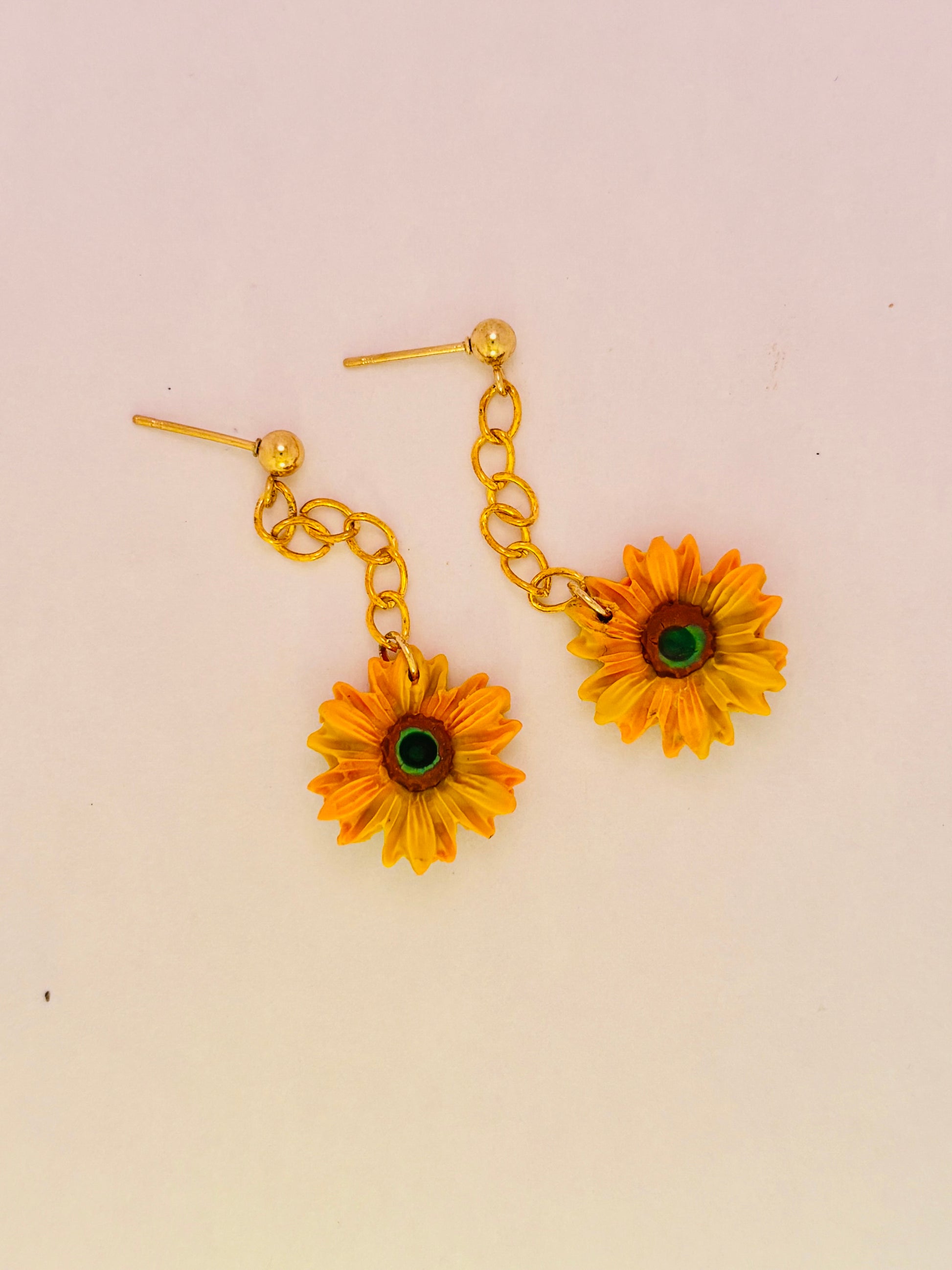 A finely detailed sunflower sways from a delicate gold chain, suspended from a ball post. Elegant yet effortless, these handcrafted earrings capture the beauty of nature with graceful movement and warmth.🌻