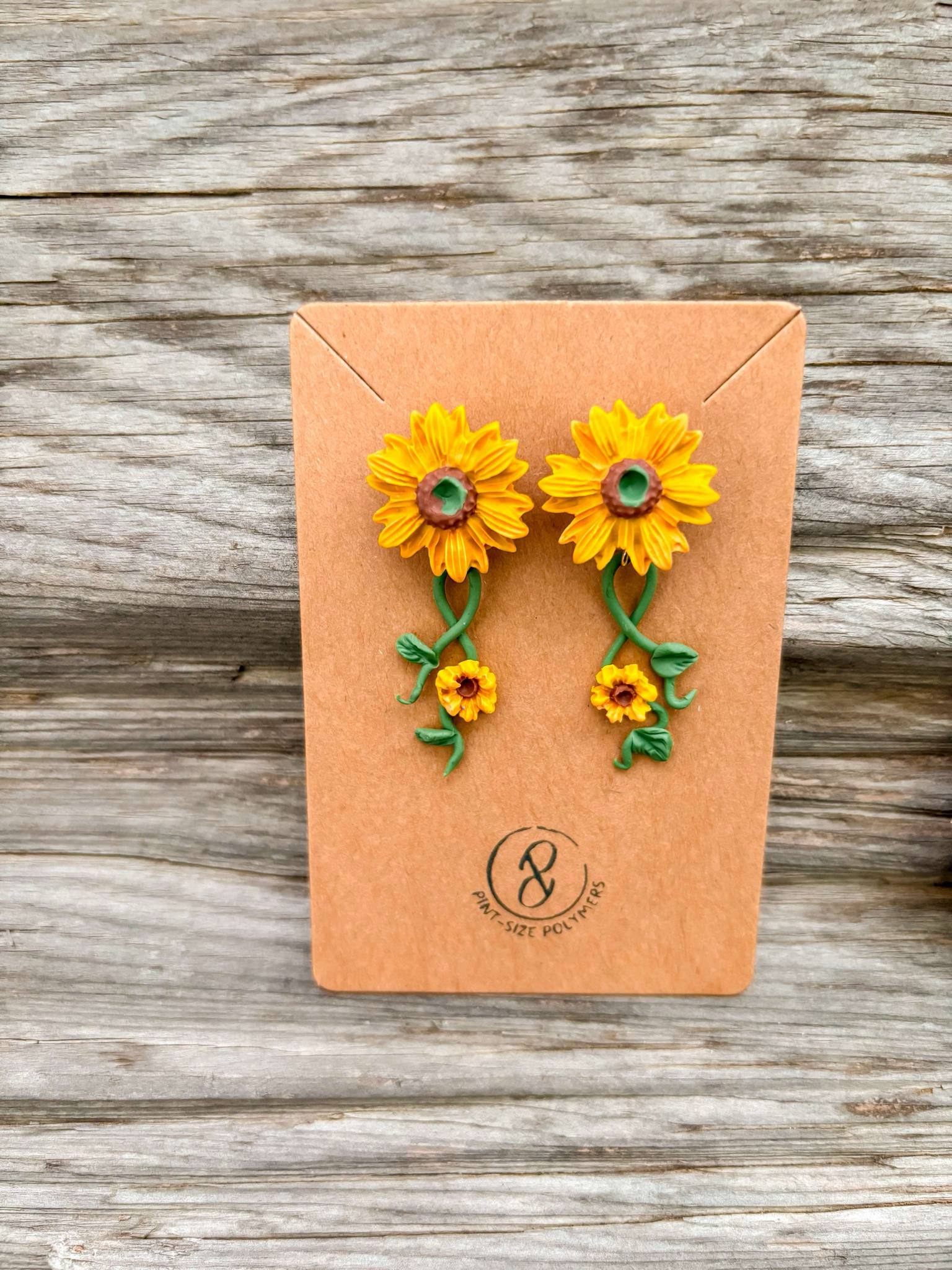 A midsommers blend of elegance and nature, these handcrafted dangle earrings feature a delicate infinity vine paired with a radiant mid-summer sunflower. Lightweight, eye-catching, and perfect for adding a touch of warmth to any outfit.
