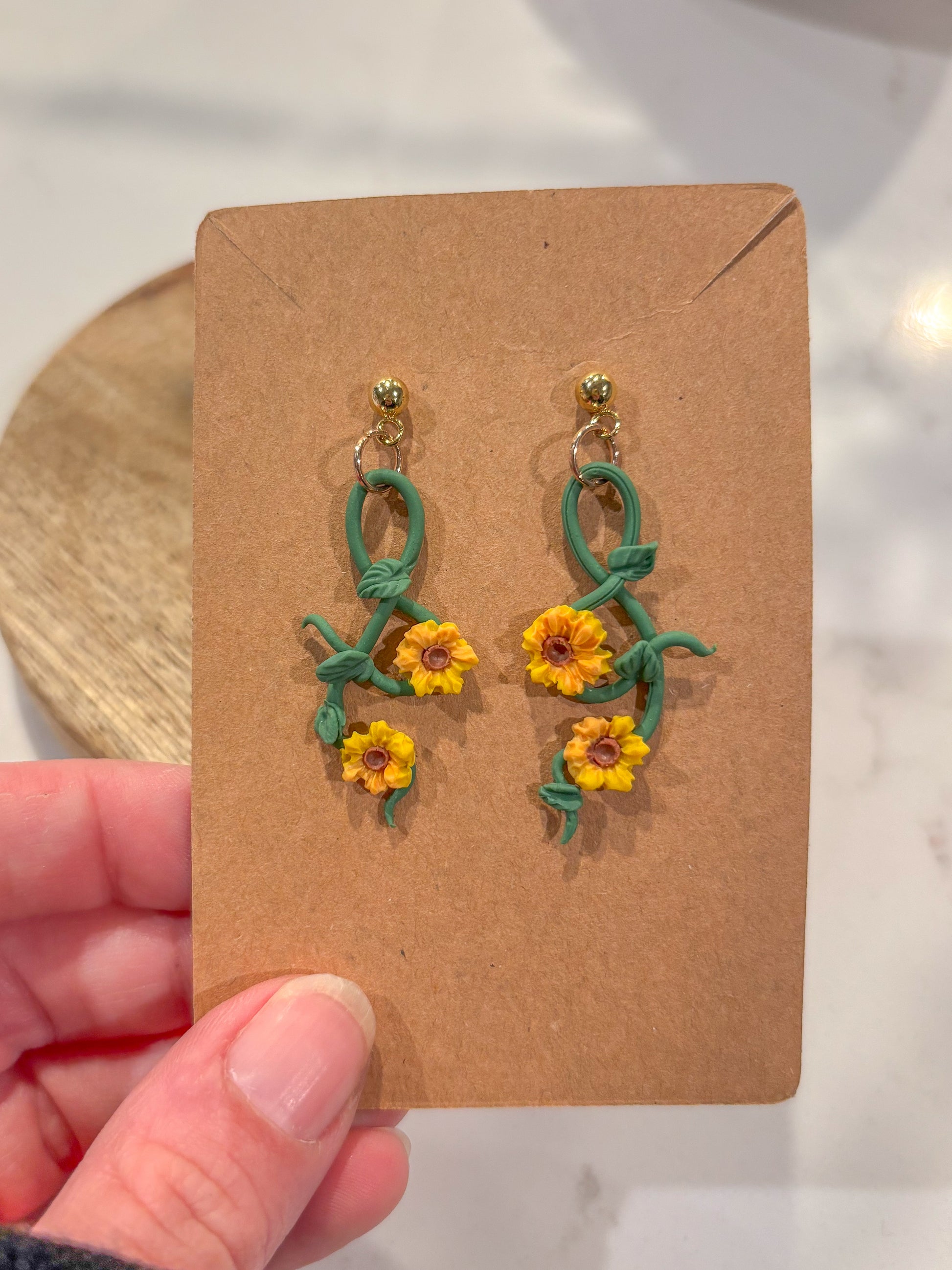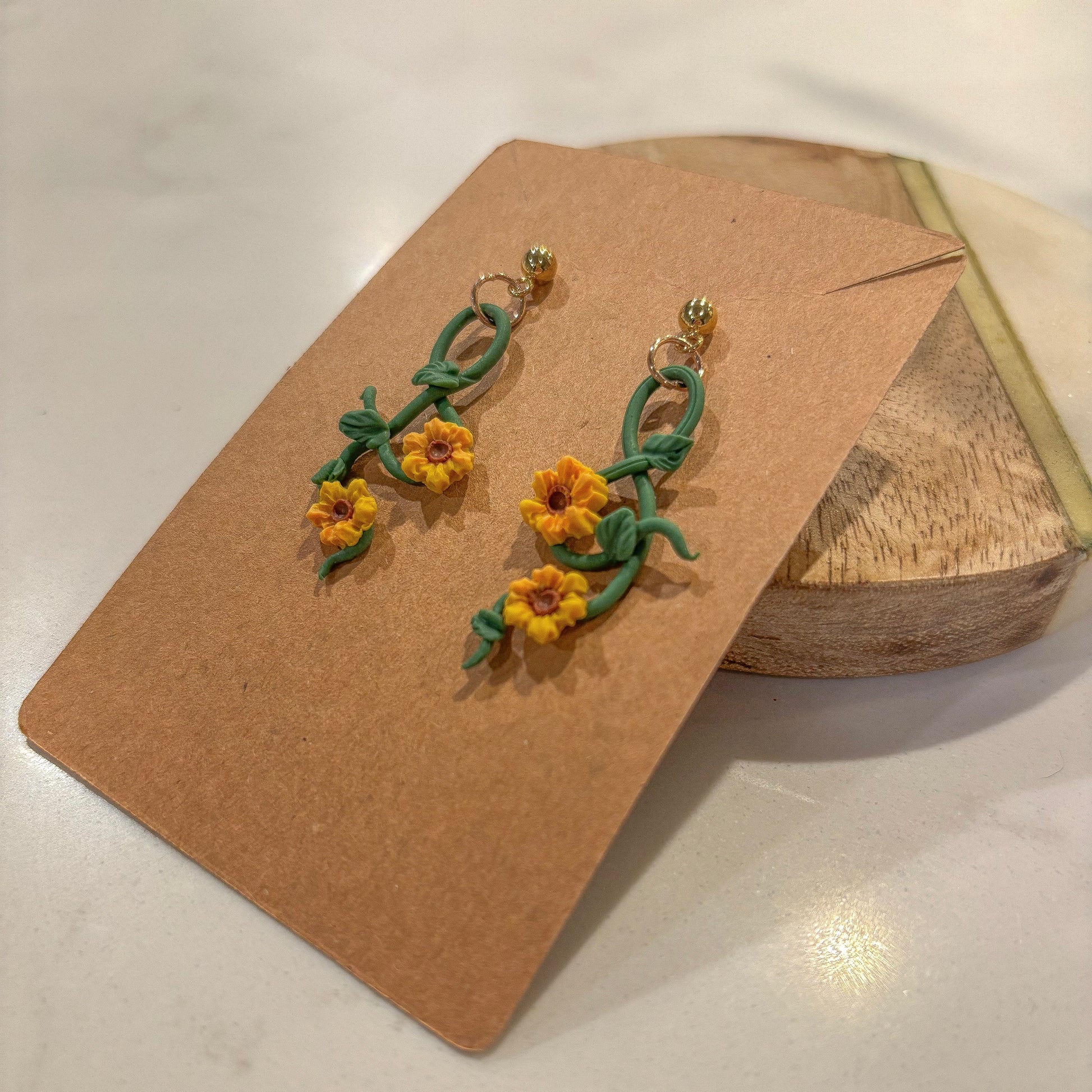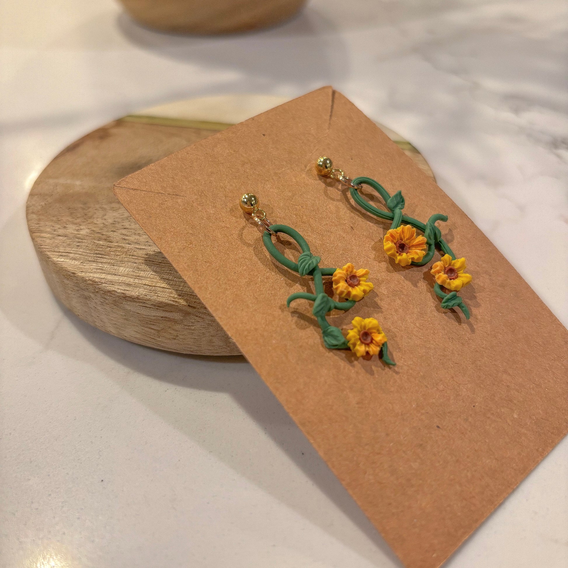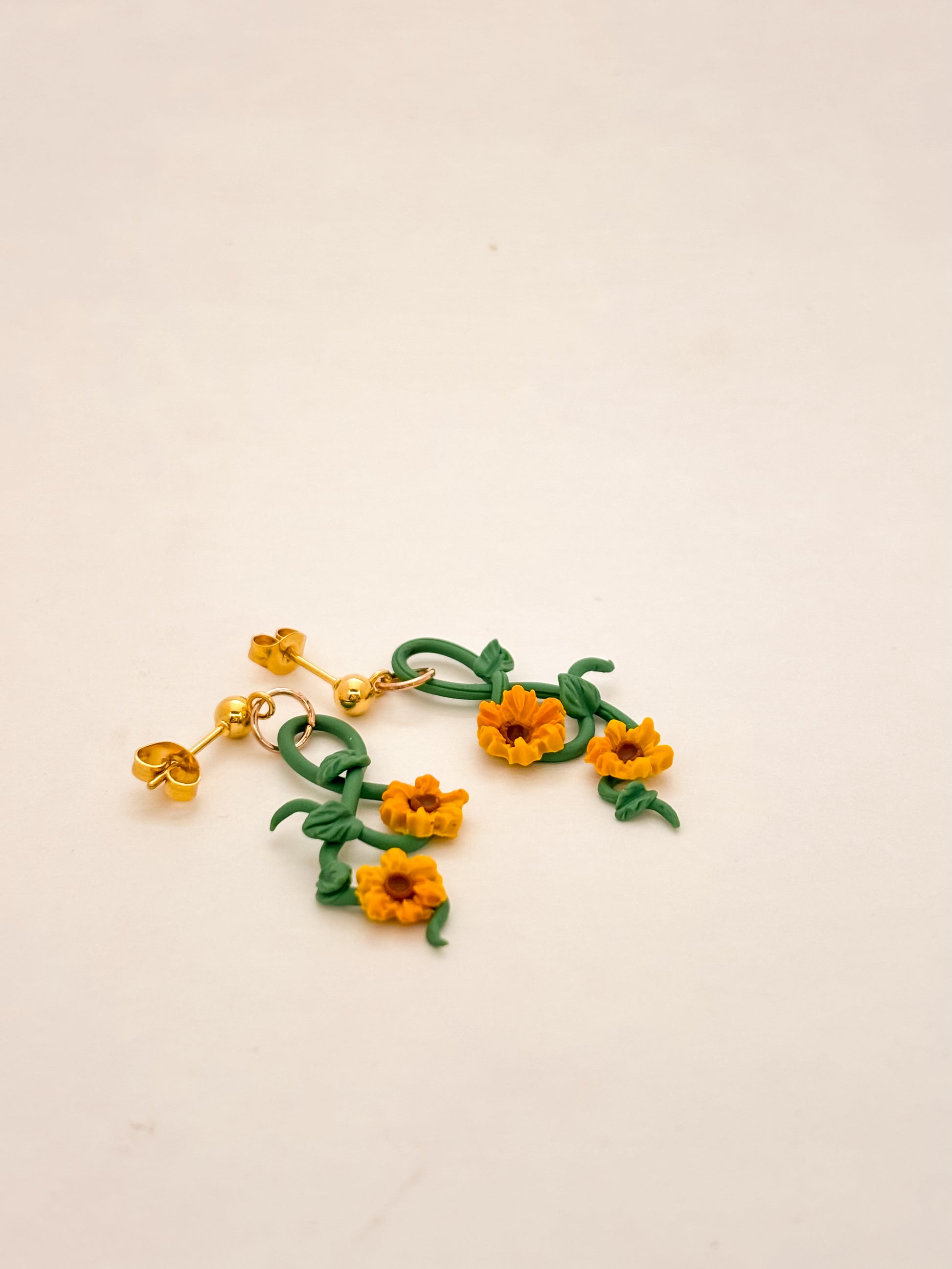 Golden sunflowers twist along sculpted vines, swaying from gold ball studs like a glimpse of summer in motion. A light, airy design that brings the season’s warmth wherever you go.🌻